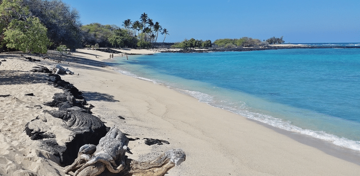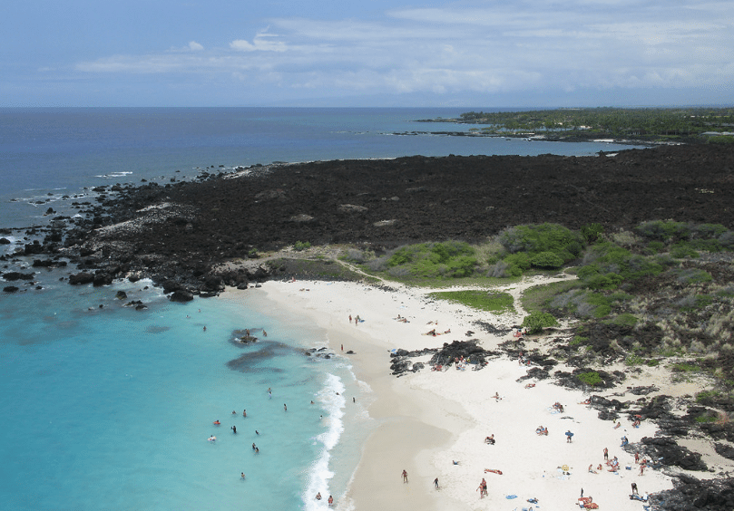The next and subsequent beaches are breathtaking white-sand, isolated beaches. Mahai’ula Beach is 28 minutes (11.6 miles) north of Kailua-Kona. The fine, white sand slopes gradually from the palm tree-lined beach into the crystal clear seas. Palm trees provide shade under which you can relax in comfort without being burned by the sun’s rays. The water is extremely rough and dangerous, making it unsuitable for children to swim. The waves can get big during the winter at Mahai’ula Beach in Mahai’ula Bay. The water has a gradual slope, however, and there are lots of vibrant coral reefs within swimming distance of the beach. The journey to the parking lot was only 5 minutes long. Mahai’ula Beach is a remote beach because people do not want to travel the bumpy lava field gravel road to get here. Many travelers bypass Route 19 by driving straight past it. If you’re looking for a quiet white sand beach near Kailua-Kona that isn’t too crowded, this is the place to go.